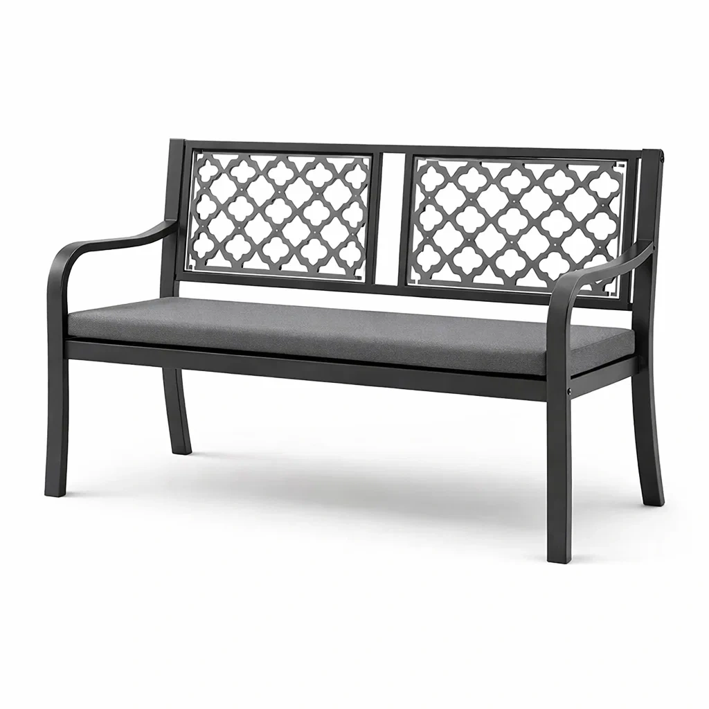 Panchina in Metallo Nero con Cuscino in Tessuto Grigio