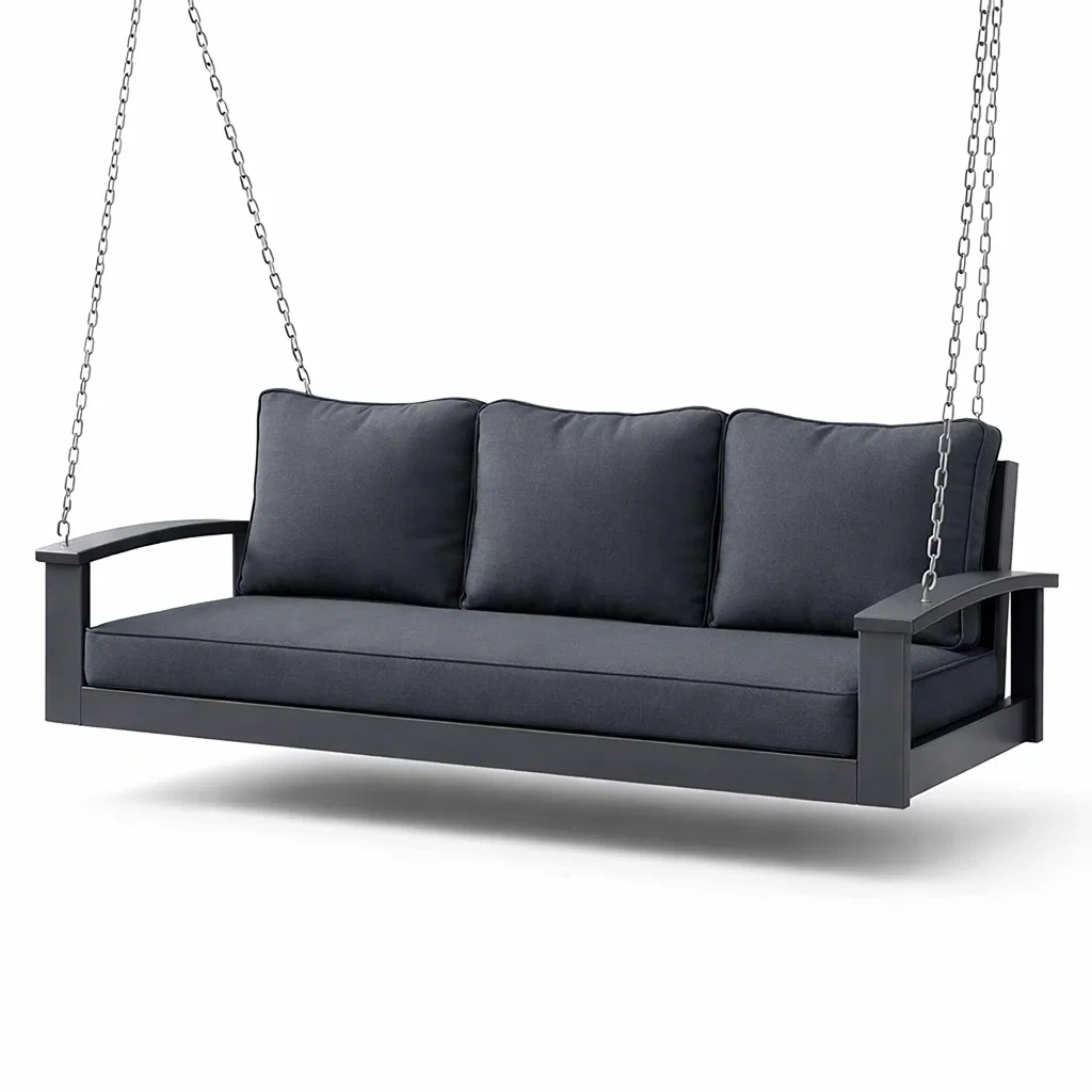 Struttura in alluminio con cuscini in tessuto di poliestere. Catene in acciaio incluse per la sospensione. Capacità di carico massima: 300 kg.