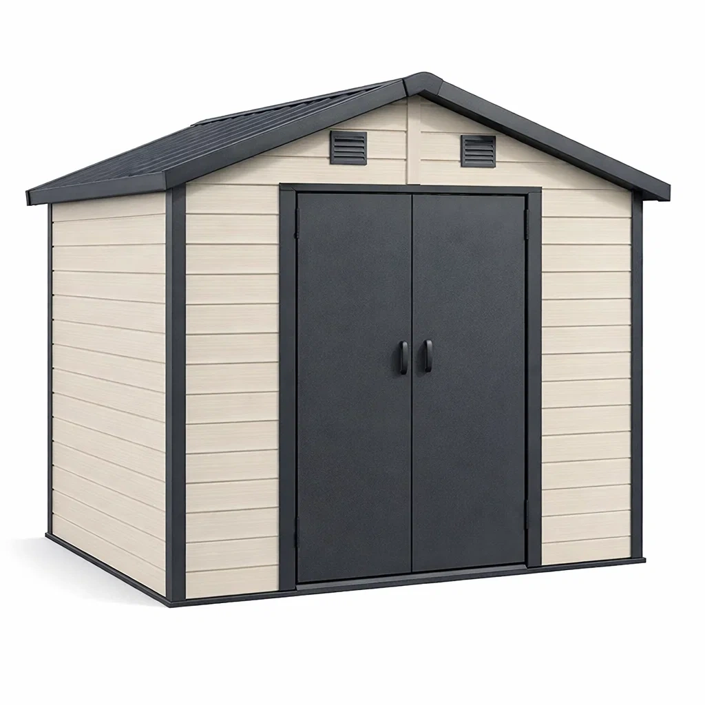 Questo capanno da giardino è realizzato in polipropilene resistente, con corpo principale, porte e tetto dello stesso materiale.