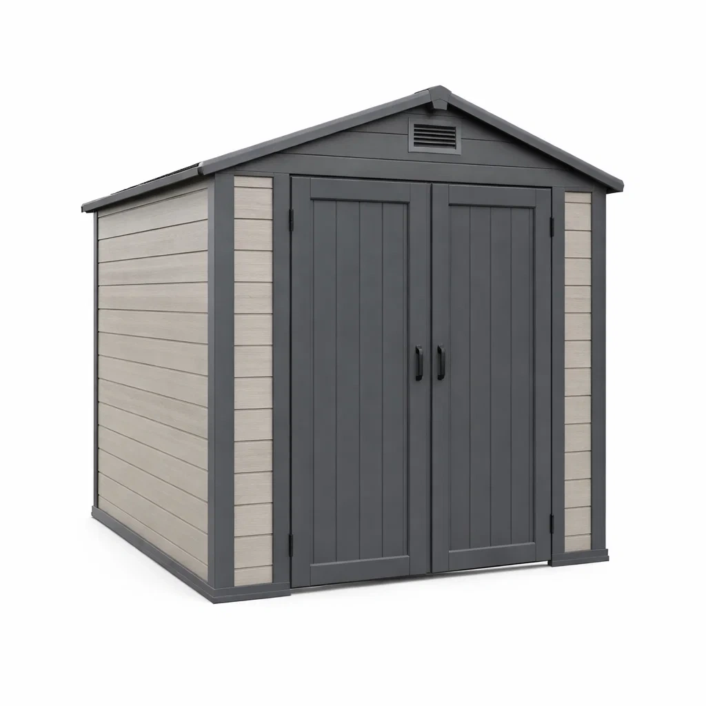 Il capanno è impermeabile e resistente ai raggi UV. È dotato di pareti, tetto e porte a doppio battente.