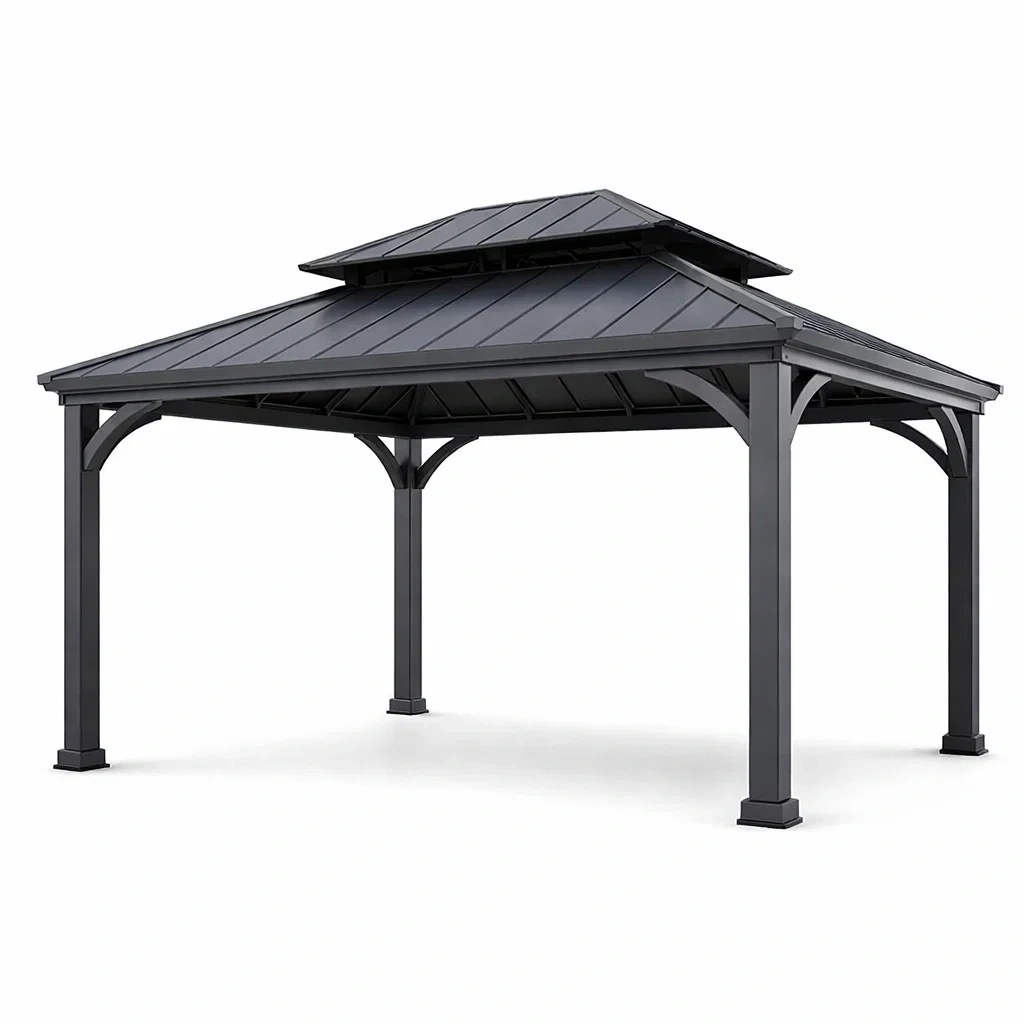 Questo gazebo è composto da una struttura robusta in alluminio e un tetto in acciaio resistente alle intemperie, progettato per uso esterno.