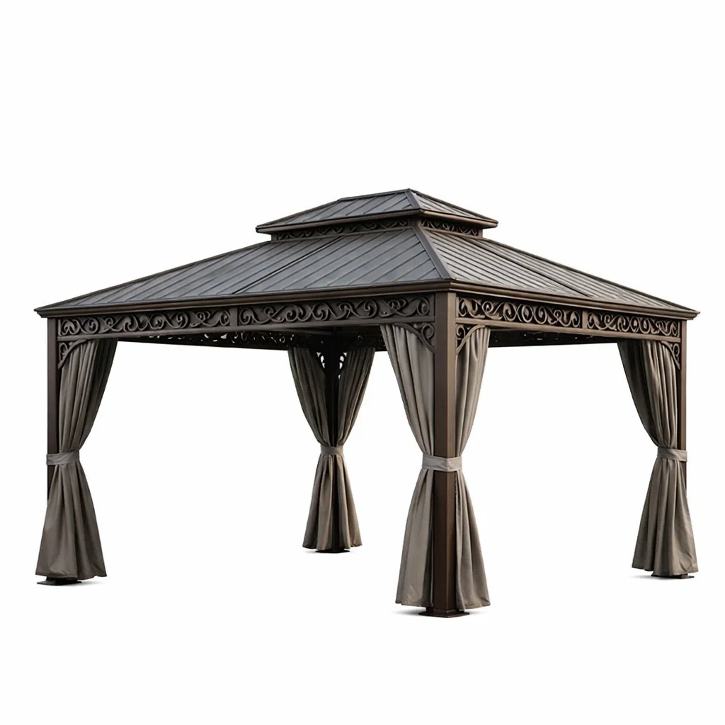 Il gazebo ha una struttura in alluminio resistente e un rivestimento in poliestere. Le tende sono di colore Marrone e Grigio. Progettato con un doppio tetto per una ventilazione superiore efficace. Dimensioni: 400 cm di lunghezza, 300 cm di larghezza e 275 cm di altezza. Peso totale di 40 kg.