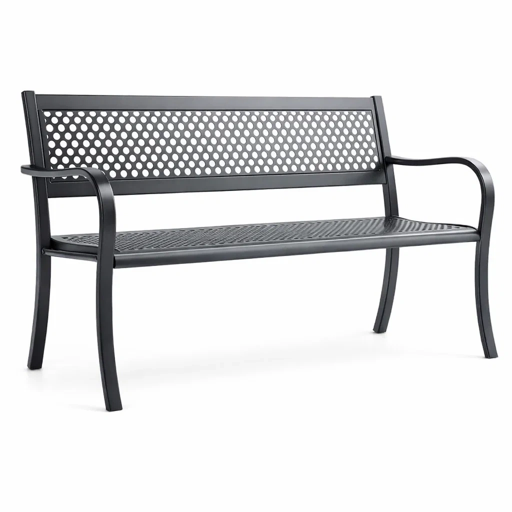 Questa panchina da esterno è realizzata in acciaio con rivestimento antiruggine. Il colore è Nero. Le dimensioni complessive sono 125 cm di lunghezza, 60 cm di larghezza e 80 cm di altezza. Il peso della panchina è di 15 kg e può sostenere un carico massimo di 200 kg. Resistente agli agenti atmosferici.