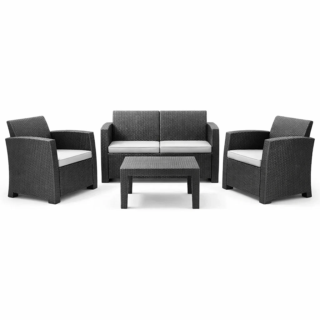 Set di mobili da giardino composto da un divano a due posti, due poltrone e un tavolino. Realizzati in polyrattan con cuscini in poliestere.