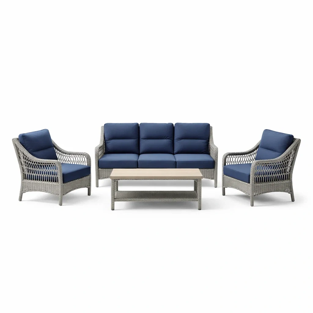 Materiale: Struttura in rattan sintetico, cuscini in poliestere, piano del tavolino in legno composito